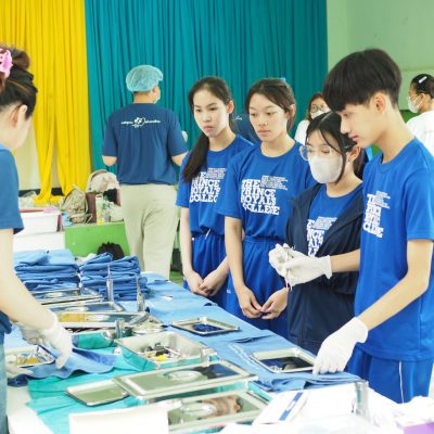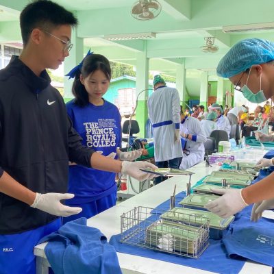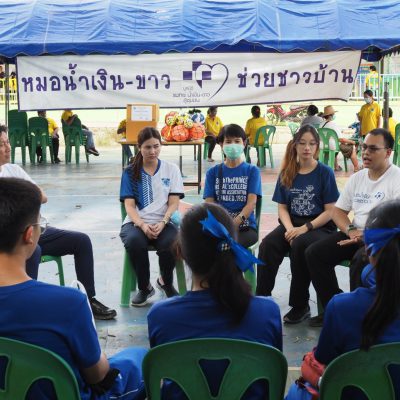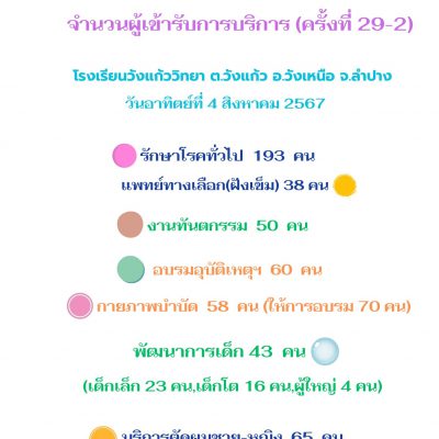 เข้าร่วมกิจกรรมในโครงการหมอน้ำเงินขาว ช่วยชาวบ้าน ครั้งที่ 29 เมื่อวันอาทิตย์ที่ 4 สิงหาคม 2567 เวลา 10.00 – 15.00 น. ณ โรงเรียนวังแก้ววิทยา ม.5 ต.วังแก้ว อ.วังเหนือ จ.ลำปาง กิจกรรมครั้งนี้เป็นการนำนักเรียนเก่าและผู้ที่สนใจประกอบวิชาชีพแพทย์ ทันตแพทย์ เภสัชกร พยาบาล นักกายภาพบำบัด ไปให้บริการส่งเสริมสุขภาพแก่ประชาชนโดยไม่คิดค่าบริการแต่อย่างใด โดยนักเรียนได้เข้าร่วมสังเกตการตรวจรักษาโรคทั่วไป การตรวจรักษาโรคฟัน การจ่ายยา การรักษา การให้ความรู้เรื่องกายภาพบำบัด การให้ความรู้เรื่องการกู้ชีพเบื้องต้น และการให้ความรู้และคำปรึกษาด้านพัฒนาการเด็ก