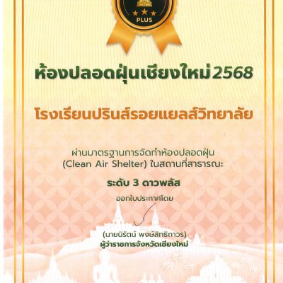 เพราะเราตระหนักว่าอากาศบริสุทธิ์มีค่าไม่น้อยไปกว่าการจัดการศึกษาที่มีคุณภาพ ทางโรงเรียนปรินส์รอยแยลส์วิทยาลัย จึงได้ติดตั้งเครื่องเติมอากาศทุกห้องเรียนเริ่มตั้งแต่ปีการศึกษา 2567 และเมื่อวันที่ 2 เมษายน 2568ดร.เกรียง ฐิติจำเริญพร ผู้จัดการ-ผู้อำนวยการโรงเรียน ได้รับ ประกาศนียบัตรรับรองมาตรฐาน “ห้องปลอดฝุ่น” (Clean Air Shelter) ระดับ 3 ดาวพลัส จาก นายศิวกร บัวป้อง รองผู้ว่าราชการจังหวัดเชียงใหม่ ในงาน Kick-off ห้องปลอดฝุ่นจังหวัดเชียงใหม่ ซึ่งจัดโดย สำนักงานสาธารณสุขจังหวัดเชียงใหม่ ณ ศูนย์การค้าเซ็นทรัลเชียงใหม่แอร์พอร์ต