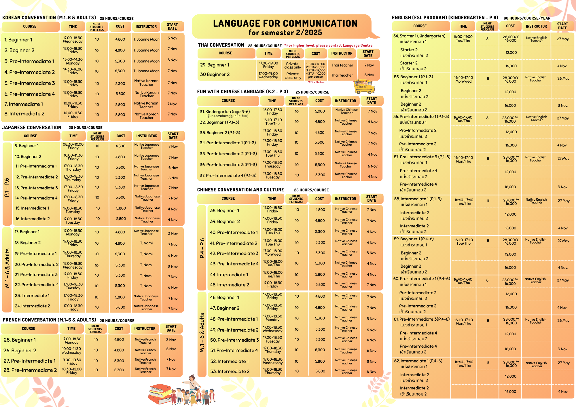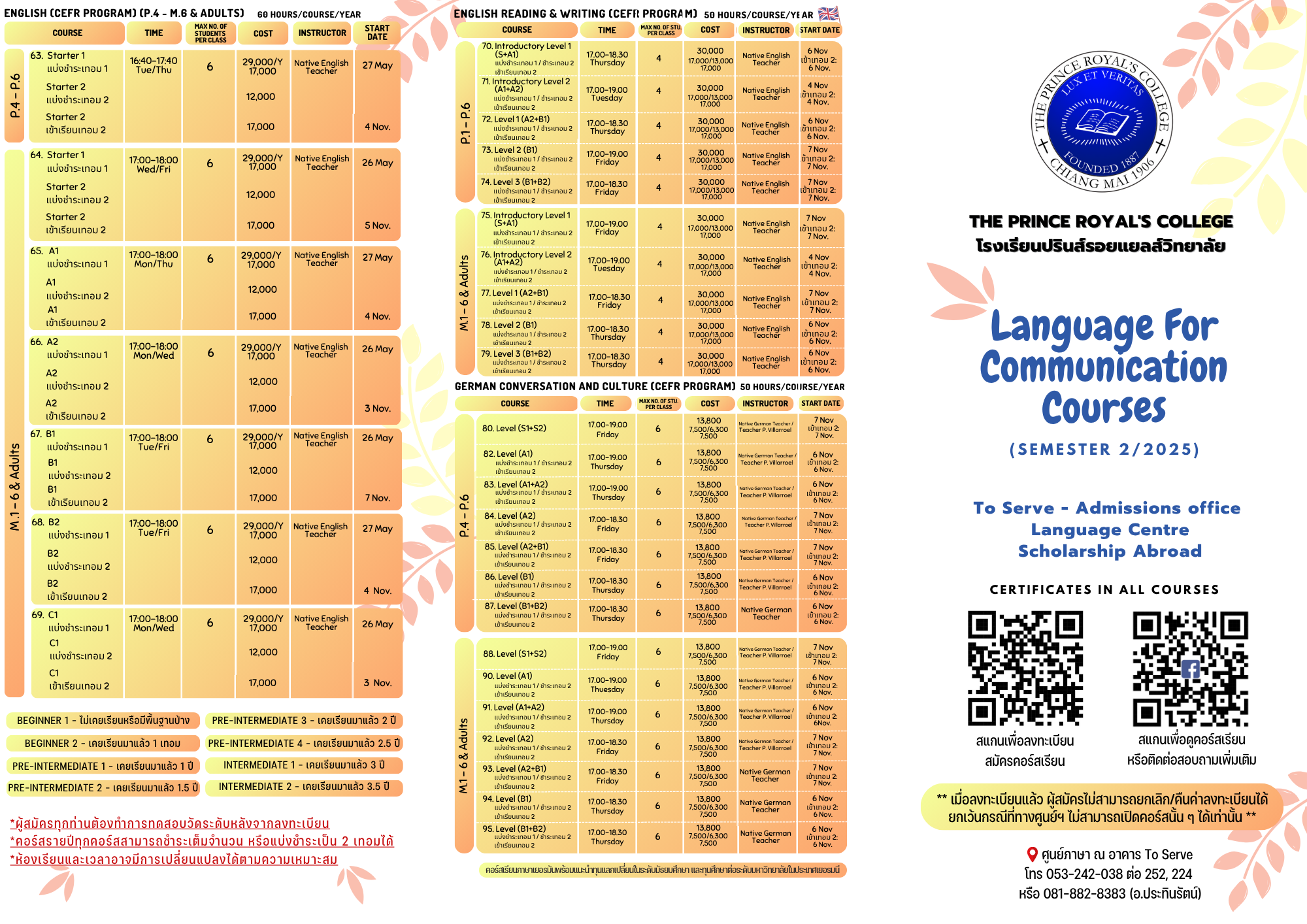 We offer Thai course and English courses or PRC General English (CEFR Program และ ESL Kids Program) and 3rd language courses including Chinese, Korean, Japanese, German and French to students, teachers and general public.
